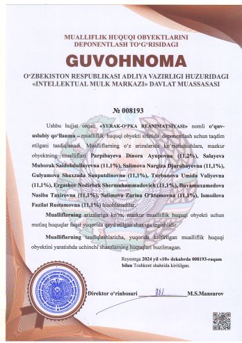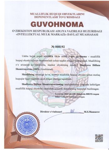 | 1895 | №008192 | O‘quv qoʻllanma- "OʻZBEK TILI" | Shadiyeva Dilfuza Shamirzayevna (100%) | Shadiyeva Dilfuza Shamirzayevna | 12/10/2024 | ![]() |