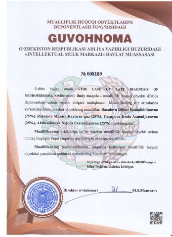 | 1898 | №008189 | Ilmiy maqola – " THE CASE OF LATE DIAGNOSIS OF NEUROFIBROMATOSIS" | Rasulova Dilbar Kamaliddinovna (25%), Rasulova Munisa Baxtiyar qizi (25%), Yusupova Iroda Axmadjanovna (25%), Abduxalikova Nigora Faxriddinovna (25%) | Rasulova Dilbar Kamaliddinovna, Rasulova Munisa Baxtiyar qizi, Yusupova Iroda Axmadjanovna, Abduxalikova Nigora Faxriddinovna | 12/10/2024 | ![]() |