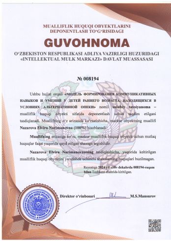 | 1893 | №008194 | Uslubiy tavsiyanoma – "МΟДЕЛЬ ФОРМИРОВАНИЯ КОММУНИКАТИВНЫХ НАВЫКОВ И УМЕНИЙ У ДЕТЕЙ РАННЕГО ВОЗРАСТА, НАХОДЯЩИХСЯ В УСЛОВИЯХ АЛЬТЕРНАТИВНОЙ ОПЕКИ" | Nazarova Elvira Narimanovna (100%) | Nazarova Elvira Narimanovna | 12/10/2024 | ![]() |