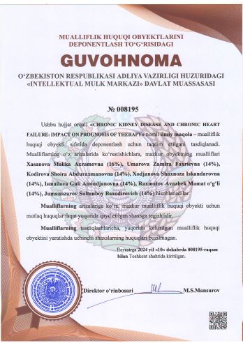 | 1892 | №008195 | Ilmiy maqola – " CHRONIC KIDNEY DISEASE AND CHRONIC HEART FAILURE: IMPACT ON PROGNOSIS OF THERAPY" | Xasanova Malika Axramovna (16%), Umarova Zamira Faxrievna (14%), Kodirova Shoira Abduraxmanovna (14%), Xodjanova Shaxnoza Iskandarovna (14%), Ismailova Guli Amindjanovna (14%), Raxmatov Avazbek Mamat o‘g‘li (14%), Jumanazarov Sultanboy Baxodirovich (14%) | Xasanova Malika Axramovna, Umarova Zamira Faxrievna, Kodirova Shoira Abduraxmanovna, Xodjanova Shaxnoza Iskandarovna, Ismailova Guli Amindjanovna, Raxmatov Avazbek Mamat o‘g‘li, Jumanazarov Sultanboy Baxodirovich | 12/10/2024 | ![]() |