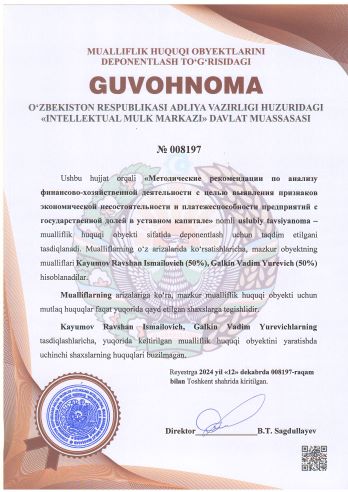 | 1890 | №008197 | Uslubiy tavsiyanoma – "Методические рекомендации по анализу финансово-хозяйственной деятельности с целью выявления признаков экономической несостоятельности и платежеспособности предприятий с государственной долей в уставном капитале" | Kayumov Ravshan Ismailovich (50%), Galkin Vadim Yurevich (50%) | Kayumov Ravshan Ismailovich, Galkin Vadim Yurevich | 12/12/2024 | ![]() |