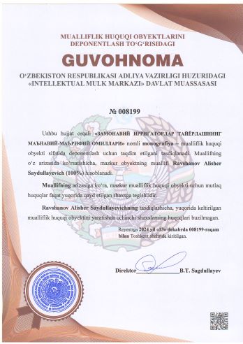 | 1888 | №008199 | Monografiya –"ЗАМОНАВИЙ ИРРИГАТОРЛАР ТАЙЁРЛАШНИНГ МАЪНАВИЙ-МАЪРИФИЙ ОМИЛЛАРИ" | Ravshanov Alisher Saydullayevich (100%) | Ravshanov Alisher Saydullayevich | 12/12/2024 | ![]() |