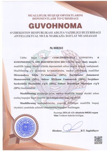 | 1885 | №008202 | Ilmiy maqola – "ЭТИОЛОГИЧЕСКАЯ СТРУКТУРА И КОМОРБИДНОСТЬ ПРИ ИШЕМИЧЕСКОМ ИНСУЛЬТЕ" | Miraxmedova Xilola To‘xtasinovna (20%), Xaytimbetov Jumamurat Shamuratovich (20%), Salixov Mirilxam Usmanovich (20%), Srojidinov Sardoriddin Shamsitdin o‘g‘li (20%), Solixov Boxodirjon Murodjon o‘g‘li (20%) | Miraxmedova Xilola To‘xtasinovna, Xaytimbetov Jumamurat Shamuratovich, Salixov Mirilxam Usmanovich, Srojidinov Sardoriddin Shamsitdin o‘g‘li, Solixov Boxodirjon Murodjon o‘g‘li | 12/12/2024 | ![]() |