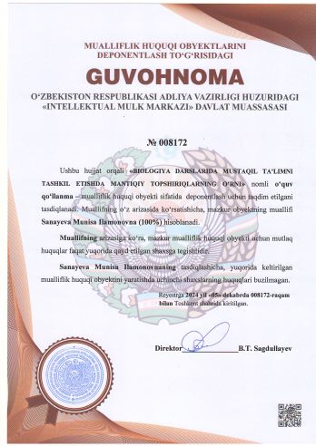 | 1915 | №008172 | O‘quv qo‘llanma – "BIOLOGIYA DARSLARIDA MUSTAQIL TA’LIMNI TASHKIL ETISHDA MANTIQIY TOPSHIRIQLARNING O’RNI" | Sanayeva Munisa Ilamonovna (100%) | Sanayeva Munisa Ilamonovna | 12/05/2024 | ![]() |