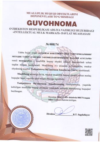 | 1913 | №008174 | Monografiya - "БЎЛAЖAК БOШЛAНҒИЧ CИНФ ЎҚИТУВЧИЛAРИНИНГ МЕТOДИК ТAЙЁРГAРЛИГИНИ ТAКOМИЛЛAШТИРИШНИНГ НAЗAРИЙ ACOCЛAРИ" | Toshpulatova Ma’muraxon Ismoilovna (100%) | Toshpulatova Ma’muraxon Ismoilovna | 12/05/2024 | ![]() |