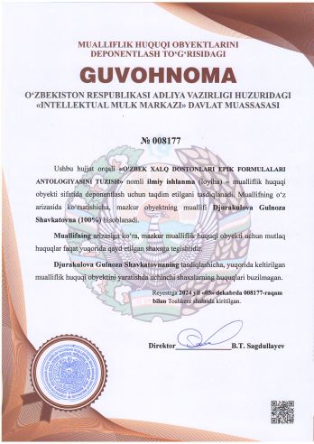 | 1910 | №008177 | Ilmiy ishlanma (loyiha) – "O'ZBEK XALQ DOSTONLARI EPIK FORMULALARI ANTOLOGIYASINI TUZISH" | Djurakulova Gulnoza Shavkatovna (100%) | Djurakulova Gulnoza Shavkatovna | 12/05/2024 | ![]() |