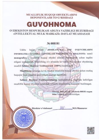 | 1906 | №008181 | Monografiya - "BOSHLANG‘ICH SINF O‘QUVCHILARINI INFORMATIKA TA’LIMIGA TAYYORLASH NAZARIYASI VA AMALIYOTI" | Sabirov Baxtiyar Yeshbayevich (100%) | Sabirov Baxtiyar Yeshbayevich | 12/10/2024 | ![]() |