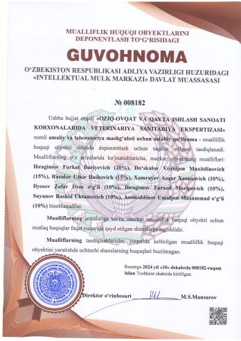 | 1905 | №008182 | Amaliy va laboratoriya mashg‘uloti uchun uslubiy qo‘llanma - "OZIQ-OVQAT VA QAYTA ISHLASH SANOATI KORXONALARIDA VETERINARIYA SANITARIYA EKSPERTIZASI" | Ibragimov Furkat Buriyevich (20%), Do‘skulov Voxidjon Muxitdinovich (15%), Rasulov Utkir Ilashovich (15%), Xamrayev Asqar Xasanovich (10%), Ilyosov Zafar Ilyos o‘g‘li (10%), Ibragimov Farxod Moripovich (10%), Suyunov Rashid Uktamovich (10%), Asomiddinov Umidjon Maxammad o‘g‘li (10%) | Ibragimov Furkat Buriyevich, Do‘skulov Voxidjon Muxitdinovich, Rasulov Utkir Ilashovich, Xamrayev Asqar Xasanovich, Ilyosov Zafar Ilyos o‘g‘li, Ibragimov Farxod Moripovich, Suyunov Rashid Uktamovich, Asomiddinov Umidjon Maxammad o‘g‘li | 12/10/2024 | ![]() |