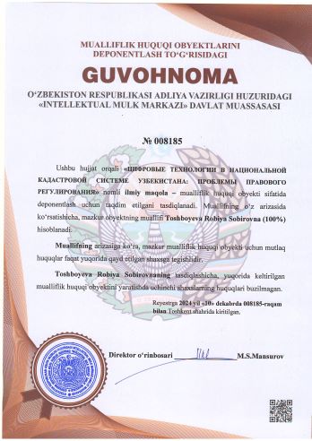 | 1902 | №008185 | Ilmiy maqola – "ЦИФРОВЫЕ ТЕХНОЛОГИИ В НАЦИОНАЛЬНОЙ КАДАСТРОВОЙ СИСТЕМЕ УЗБЕКИСТАНА: ПРОБЛЕМЫ ПРАВОВОГО РЕГУЛИРОВАНИЯ" | Toshboyeva Robiya Sobirovna (100%) | Toshboyeva Robiya Sobirovna | 12/10/2024 | ![]() |