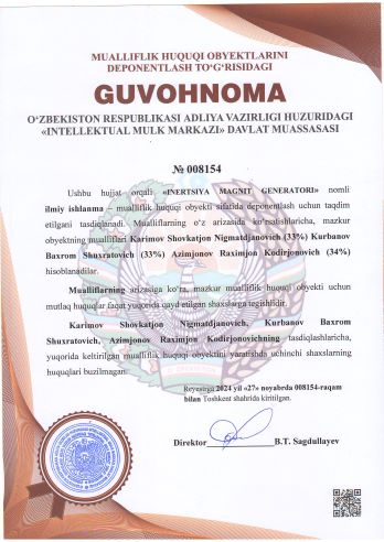 | 1933 | №008154 | Ilmiy ishlanma – "INERTSIYA MAGNIT GENERATORI" | Karimov Shovkatjon Nigmatdjanovich (33%) Kurbanov Baxrom Shuxratovich (33%) Azimjonov Raximjon Kodirjonovich (34%) | Karimov Shovkatjon Nigmatdjanovich, Kurbanov Baxrom Shuxratovich, Azimjonov Raximjon Kodirjonovich | 11/27/2024 | ![]() |