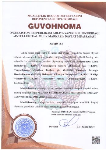 | 1930 | №008157 | Stol o‘yini - "КТО Я" | Suleymanova Xilola Rashitovna (14,28%) Abdumajitova Sayora Abdumajit kizi (14,28%) Turganbayeva Mehribon Tolibay qizi (14,28%) Kamilova Farangiz Baxriddinovna (14,28%) Babayans Viktoriya Sergeyevna (14,28%) Li Olga Viktorovna (14,28%) Rustamov Farxod Ubaydullayevich (14,26%) | “YAGONA UMUMRESPUBLIKA PROTSESSING MARKAZI” AKSIYADORLIK JAMIYATI | 11/29/2024 | ![]() |