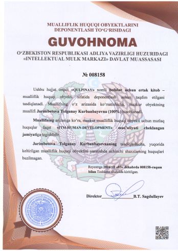 | 1929 | №008158 | Bolalar uchun ertak kitob –"QULPINAY" | Jarimbetova Tolganay Kurbanbayevna (100%) | «ITM-HUMAN-DEVELOPMENT» mas’uliyati cheklangan jamiyati | 12/03/2024 | ![]() |