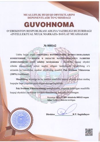 | 1925 | №008162 | Uslubiy tavsiyanoma –"МЕТОДИКА ФОРМИРОВАНИЯ ПРОФЕССИОНАЛЬНЫХ КОМПЕТЕНЦИЙ СТУДЕНТОВ В ОБЛАСТИ МАТЕМАТИЧЕСКОГО РАЗВИТИЯ ДОШКОЛЬНИКОВ" | Pak Svetlana Viktorovna (100%) | Pak Svetlana Viktorovna | 12/03/2024 | ![]() |