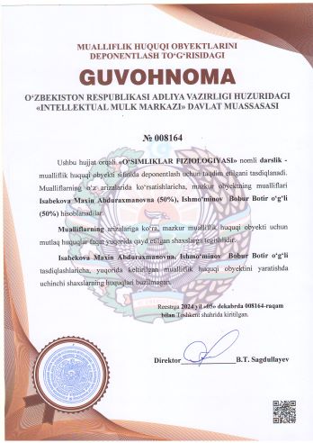 | 1923 | №008164 | Darslik - "O‘SIMLIKLAR FIZIOLOGIYASI" | Isabekova Maxin Abduraxmanovna (50%), Ishmo‘minov Bobur Botir o‘g‘li (50%) | Isabekova Maxin Abduraxmanovna, Ishmo‘minov Bobur Botir o‘g‘li | 12/05/2024 | ![]() |