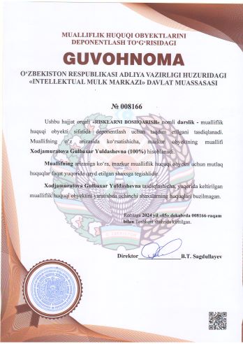 | 1921 | №008166 | Darslik – "RISKLARNI BOSHQARISH" | Xodjamuratova Gulbaxar Yuldashevna (100%) | Xodjamuratova Gulbaxar Yuldashevna | 12/05/2024 | ![]() |