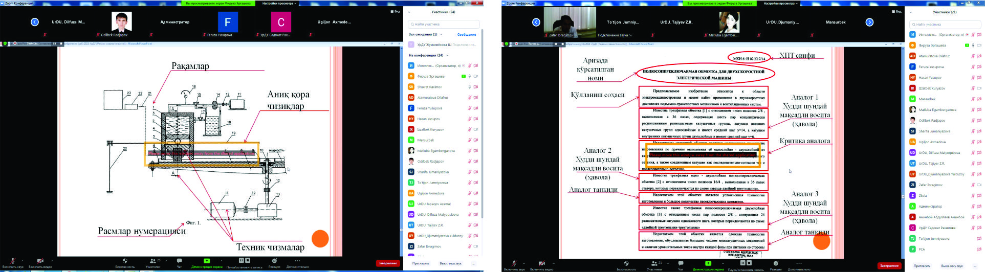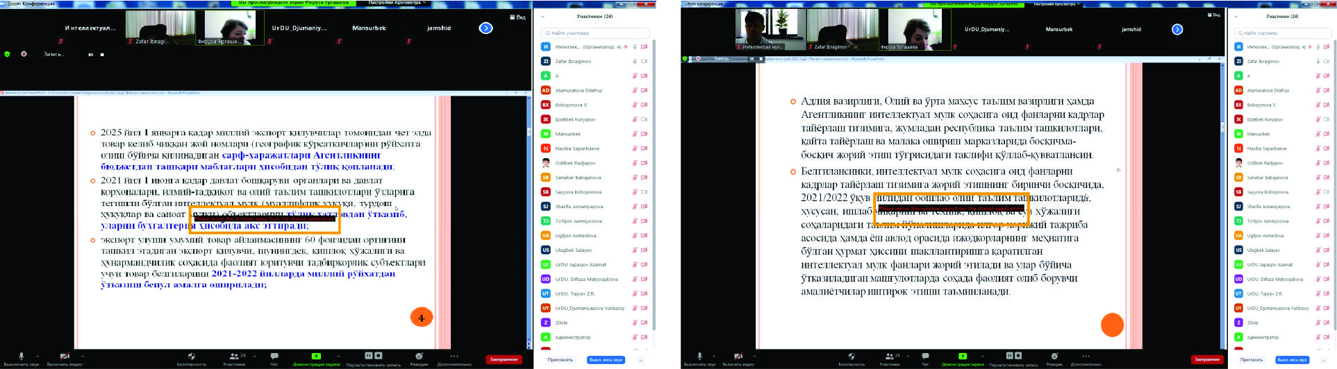 2021-yil 29-aprel kuni TIQQMda o’tkazilishi rejalashtirilgan tadbirlarning tasdiqlangan reja-jadvali asosida Urganch davlat universitetida, O’zbekiston Respublikasi Adliya vazirligi huzuridagi Intellektual mulk agentligi xodimlari tomonidan navbatdagi seminar o'tkazildi. Mazkur seminar karantin talablariga ko’ra online tarzda ZOOM dasturidan foydalangan holda tashkil etildi. Online seminarda universitet ilmiy ishlar va innovatsiyalar bo’yicha prorektori Ibragimov Zafar Shavkatovich, professor-o’qituvchilari, doktarantlar, yosh ilmiy xodimlar ishtirok etishdi.