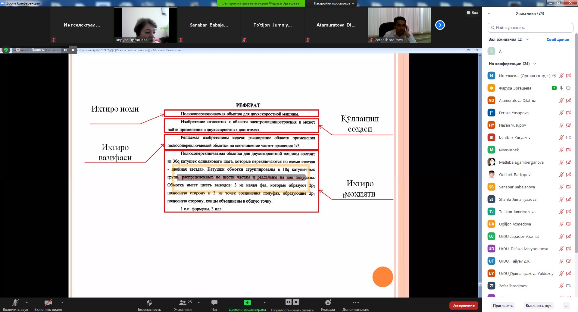 Online seminar ishtirokchilariga mavzuga oid rasmiy axborotnomani Intellektual mulk agentligining rasmiy web saytidan yuklab olishlari mumkunligi aytib o’tildi.