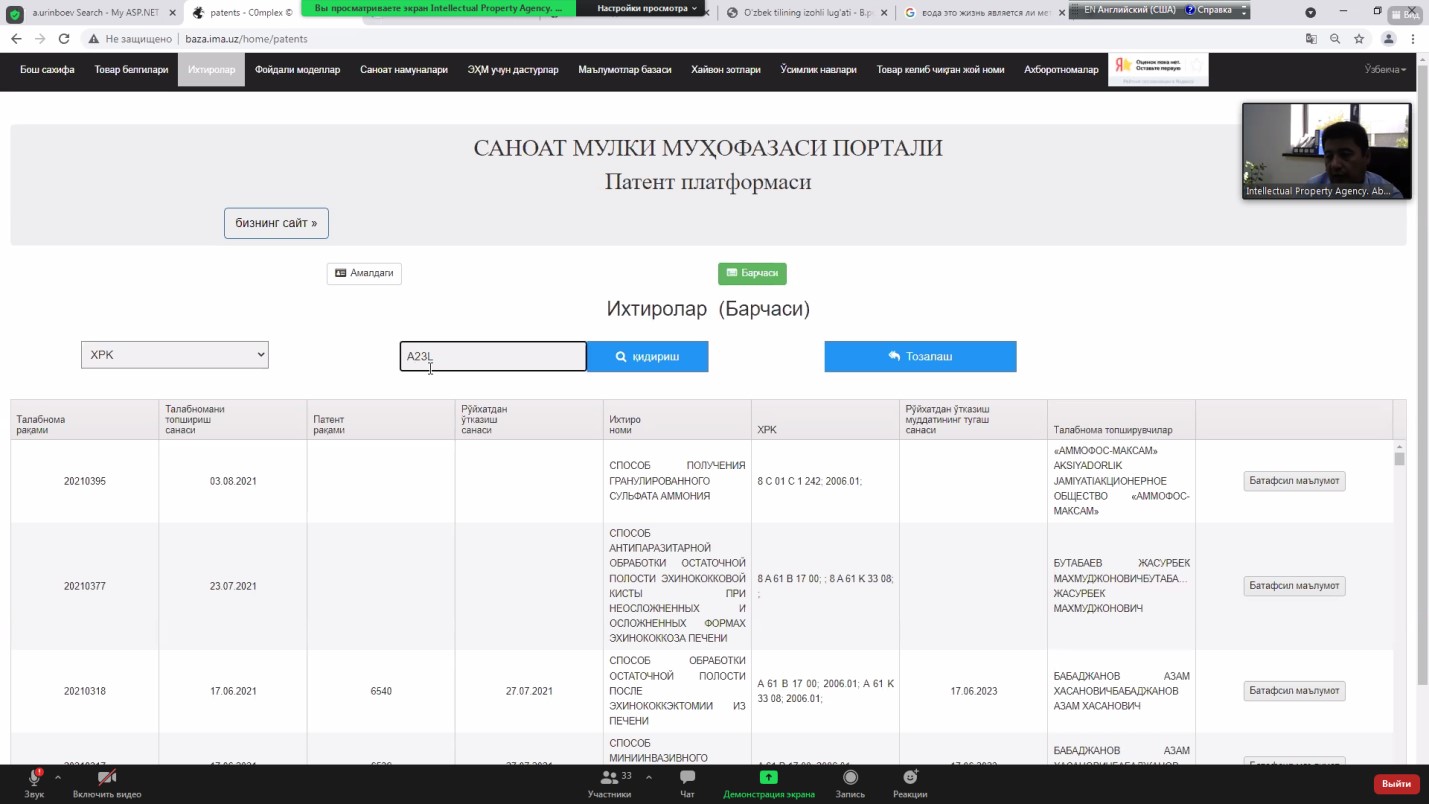 Online seminarda taʼlim muassasalarining universitet professor-o’qituvchilari, doktarantlar, yosh ilmiy xodimlar ishtirok etishdi. Seminar mavzusini Adliya Vazirligi huzuridagi Intellektual mulk agentligi “Sanoat namunalari” bo’lim boshlig’i O’rinboyev A.J yoritib berdi.