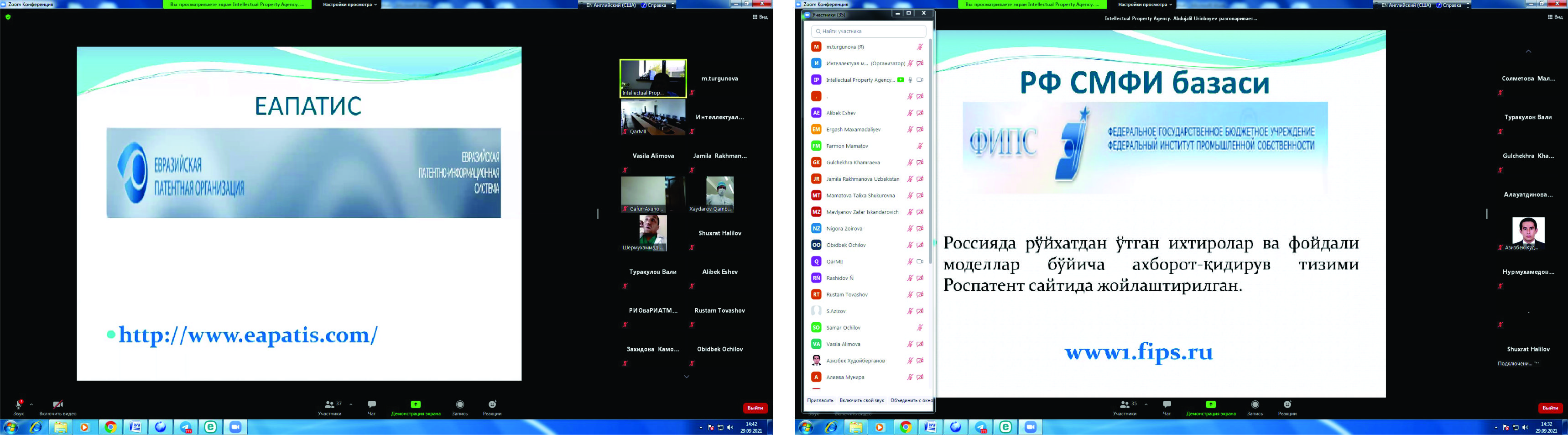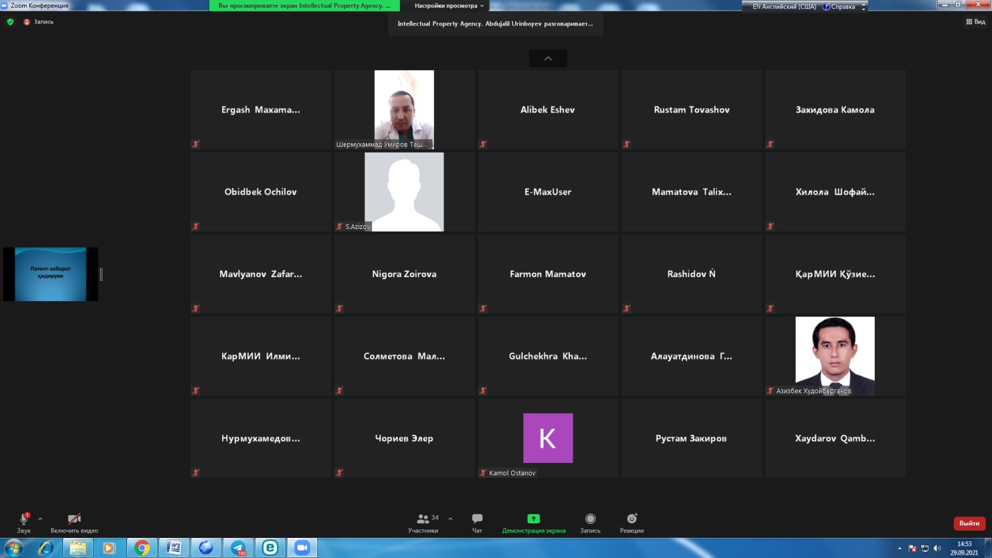 2021-yil 29-sentyabr kuni O’zbekiston Respublikasi Adliya vazirligi huzuridagi Intellektual mulk agentligi va agentlikning konsultativ markazi mutaxassislari ishtirokida Qarshi muhandislik iqtisodiyot instituti hamda Toshkent Tibbiyot xodimlarining kasbiy malakasini oshirish markazi huzuridagi Texnologiyalar va innovatsiyalarni qo’llab-quvatlash markazi bilan birgalikda 2021 yilda o’tkazilishi rejalashtirilgan Tarmoqli reja-jadvali asosida navbatdagi seminar o’tkazildi. Mazkur seminar karantin talablariga ko’ra online tarzda ZOOM dasturidan foydalangan holda tashkil etildi.