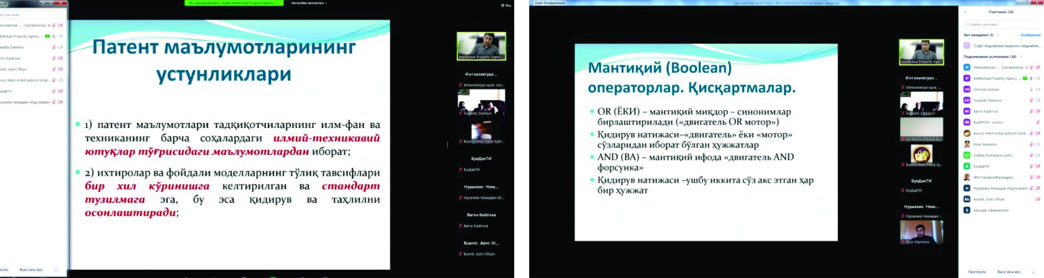 Seminarda maxsus patent bazalari, patent-axborot qidiruv tizimidan qay tartibda foydalana olishlari to‘g‘risida hamda xorjiy mamlakat patent bazalari haqida ma’ruza qilindi. professor-o‘qituvchilar faol ishtirok etdi.