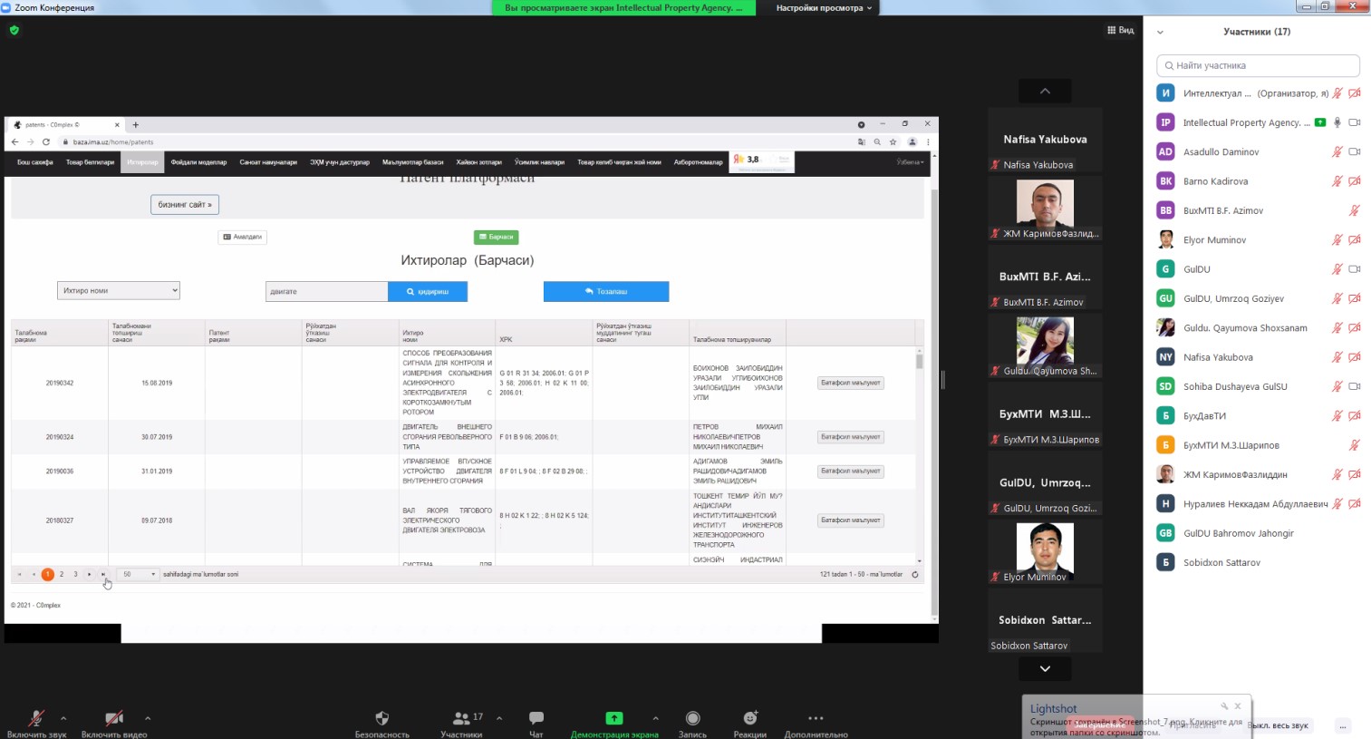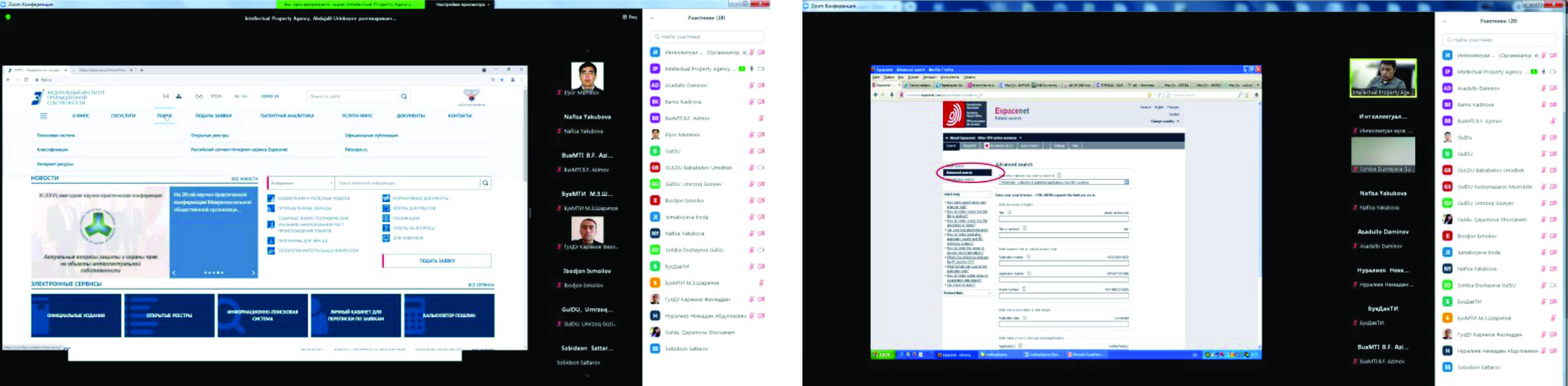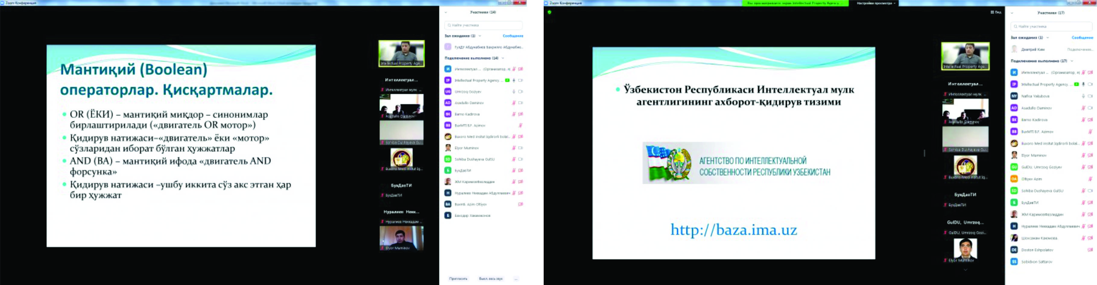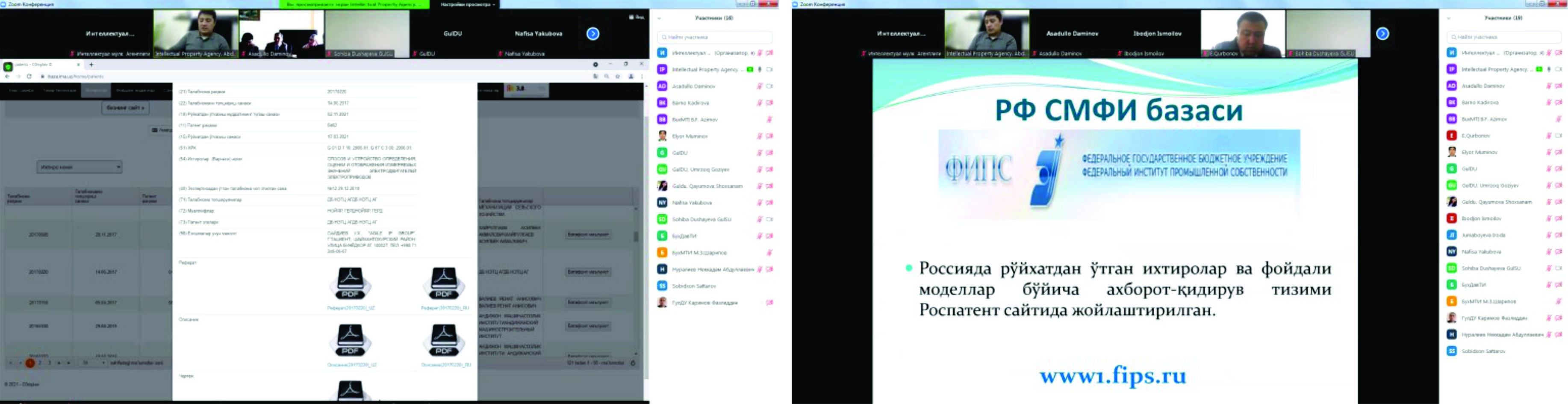 2021-yil 30 noyabr kuni O‘zbekiston Respublikasi Adliya vazirligi huzuridagi Intellektual mulk agentligi va agentlikning konsultativ markazi mutaxassislari ishtirokida Guliston davlat universiteti, Samarqand veterinariya medisinasi, Buxoro muxandislik texnologiyalar va Buxoro davlat tibbiyot institutlari hamda “Navoi” EIX Direksiyasi huzuridagi Texnologiyalar va innovatsiyalarni qo‘llab-quvatlash markazi bilan birgalikda 2021 yilda o‘tkazilishi rejalashtirilgan Tarmoqli reja-jadvali asosida navbatdagi seminar o‘tkazildi. Mazkur seminar karantin talablariga ko‘ra online tarzda ZOOM dasturidan foydalangan holda tashkil etildi.