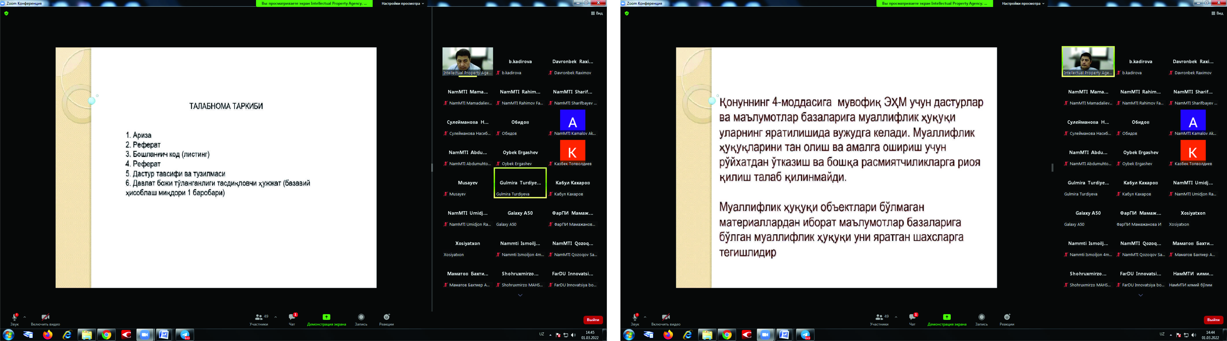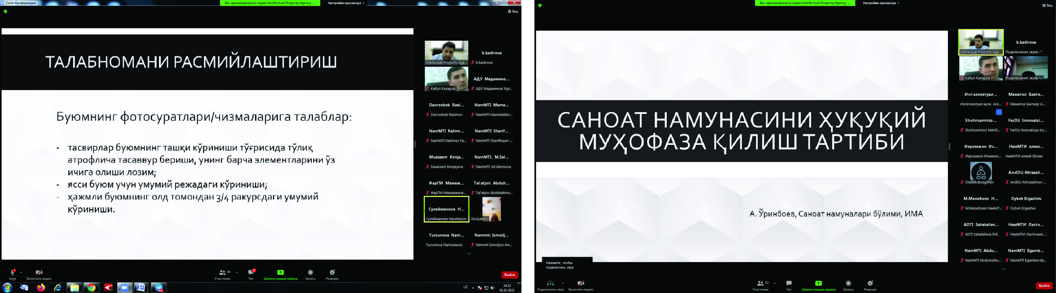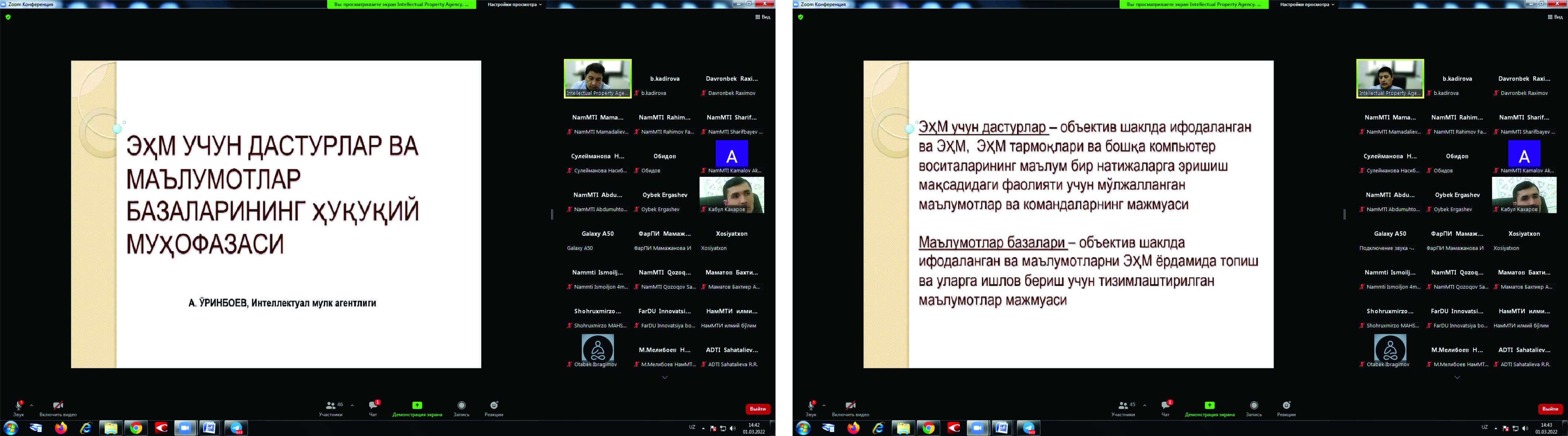 2022 yil 1-mart kuni O‘zbekiston Respublikasi Prezidentining 2021 yil 28-yanvardagi “Intellektual mulk obektlarini muhofaza qilish tizimini takomillashtirish chora tadbirlari to‘g‘risida”gi PQ-4965-son qarori bilan tasdiqlangan Intellektual mulk (ixtiro, foydali model, sanoat namunasi, seleksiya yutuqlari) sohasini rivojlantirish bo‘yicha 2021 — 2023 yillarga mo‘ljallangan amaliy ishlar ijrosi yuzasidan Dasturining 15.3 bandini hududlarda sohaviy “fan - ta’lim - ishlab chiqarish” integratsiyalashuvini ixtirochilar, innovatorlar, biznes-jamoalar, ta’lim va ilm yoshlariga maxsus axborotlar bazasi, boshqa axborot resurslardan foydalanishni o‘rgatish maqsadida O‘zbekiston Respublikasi Adliya vazirligi huzuridagi Intellektual mulk agentligi va agentlikning konsultativ markazi mutaxassislari ishtirokida Andijon davlat tibbiyot instituti, Namangan muxandislik-texnologiya instituti, hamda Farg‘ona va Andijon davlat universitetlari bilan birgalikda 2022 yilda o‘tkazilishi rejalashtirilgan Tarmoqli reja-jadvali asosida “Sanoat namunasini huquqiy muhofaza qilish tartibi” va “EHM uchun dastur va ma’lumotlar bazalarining huquqiy muhofazasi” mavzusida navbatdagi seminar o‘tkazildi. Mazkur seminar onlayn tarzda ZOOM dasturidan foydalangan holda tashkil etildi.