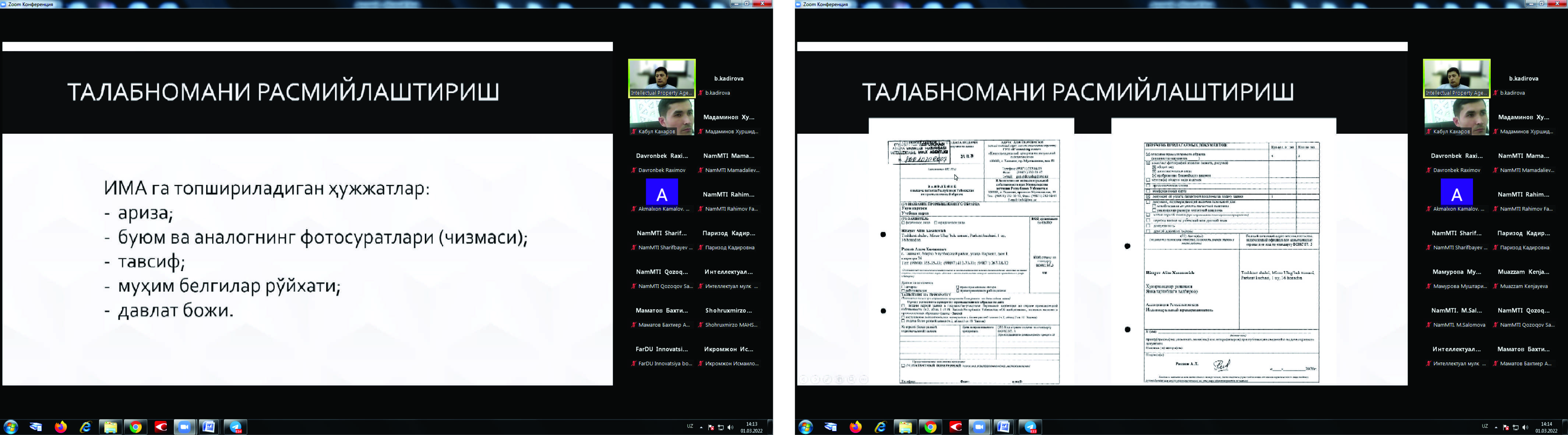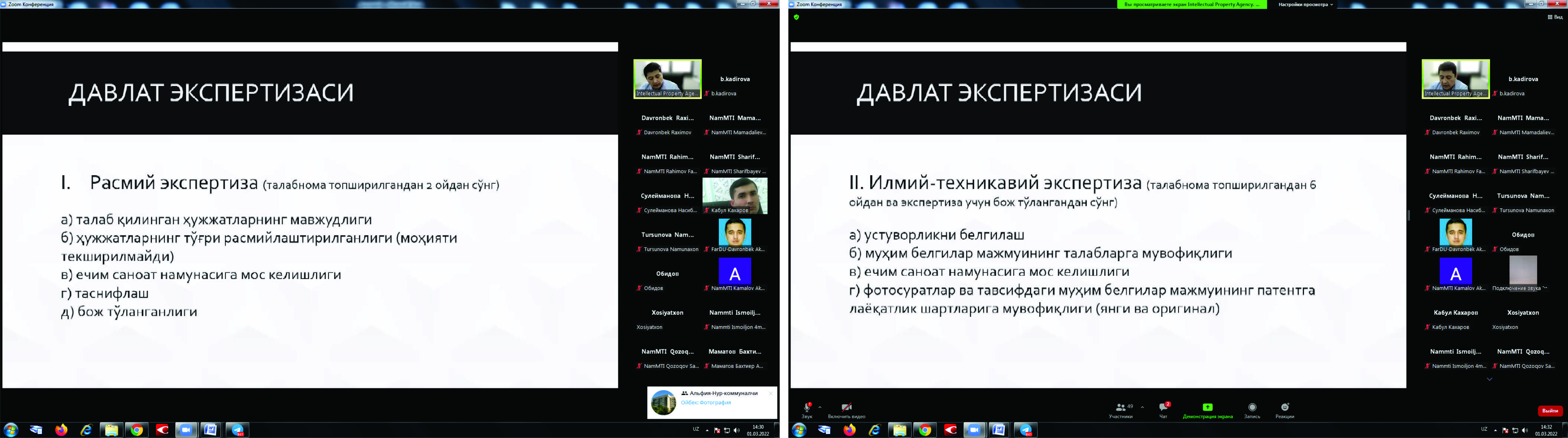 Onlayn seminarda ta’lim muassasalarining professor-o‘qituvchilari, doktarantlar, yosh ilmiy xodimlar ishtirok etishdi. Seminar mavzusini Adliya Vazirligi huzuridagi Intellektual mulk agentligi “Sanoat namunalari” bo‘lim boshlig‘i O‘rinboyev A.J. yoritib berdi.