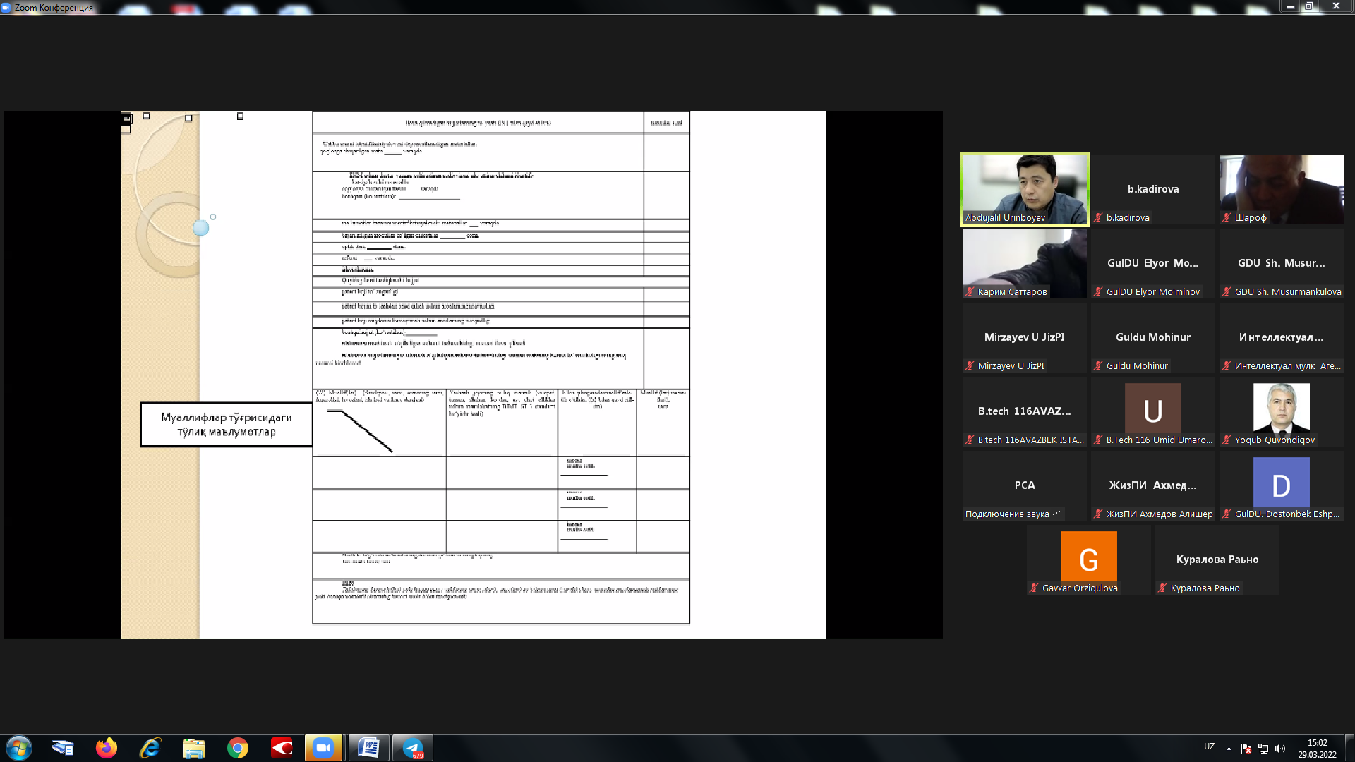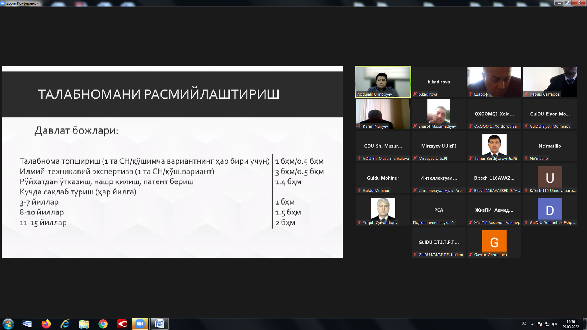 Onlayn seminarda ta’lim muassasalarining professor-o‘qituvchilari, doktarantlar, yosh ilmiy xodimlar ishtirok etishdi. Seminar mavzusini Adliya Vazirligi huzuridagi Intellektual mulk agentligi “Sanoat namunalari” bo‘lim boshlig‘i O‘rinboyev A.J. yoritib berdi.
