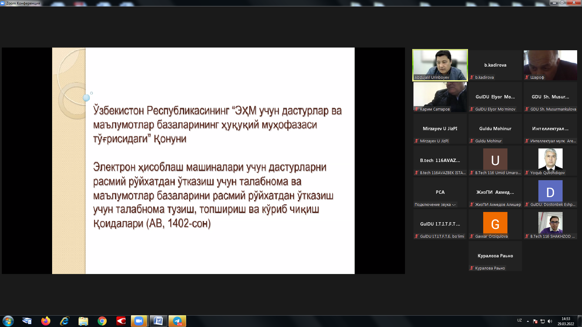 2022 yil 29-mart kuni O’zbekiston Respublikasi Prezidentining 2021 yil 28-yanvardagi “Intellektual mulk obektlarini muhofaza qilish tizimini takomillashtirish chora tadbirlari to’g’risida”gi PQ-4965-son qarori bilan tasdiqlangan Intellektual mulk (ixtiro, foydali model, sanoat namunasi, seleksiya yutuqlari) sohasini rivojlantirish bo‘yicha 2021 — 2023 yillarga mo‘ljallangan amaliy ishlar ijrosi yuzasidan O‘zbekiston Respublikasi Adliya vazirligi huzuridagi Intellektual mulk agentligi va agentlikning konsultativ markazi mutaxassislari ishtirokida Guliston davlat universiteti hamda Jizzax politexnika institutlari bilan birgalikda 2022 yilda o‘tkazilishi rejalashtirilgan tarmoqli reja-jadvali asosida “Sanoat namunasini huquqiy muhofaza qilish tartibi” va “EHM uchun dastrular va ma’lumotlar bazalarining huquqiy muhofazasi” mavzusida navbatdagi seminar o‘tkazildi. Mazkur seminar onlayn tarzda ZOOM dasturidan foydalangan holda tashkil etildi.