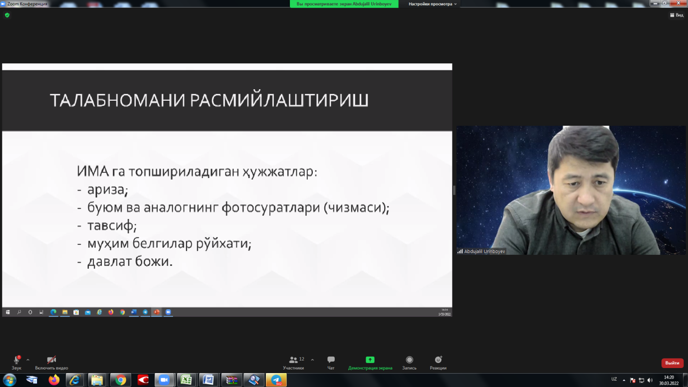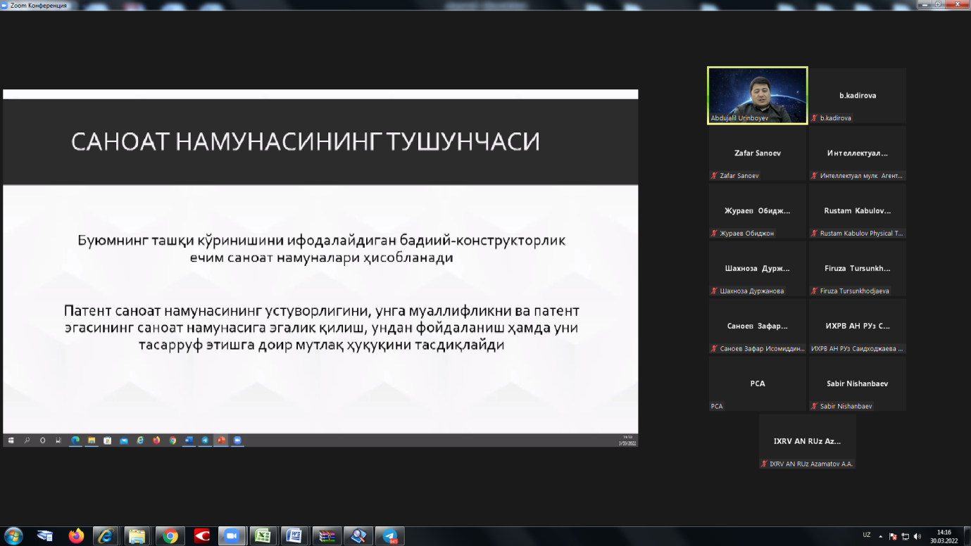 Onlayn seminarda ta’lim muassasalarining professor-o‘qituvchilari, doktarantlar, yosh ilmiy xodimlar ishtirok etishdi. Seminar mavzusini Adliya Vazirligi huzuridagi Intellektual mulk agentligi “Sanoat namunalari” bo‘lim boshlig‘i O‘rinboyev A.J. yoritib berdi.