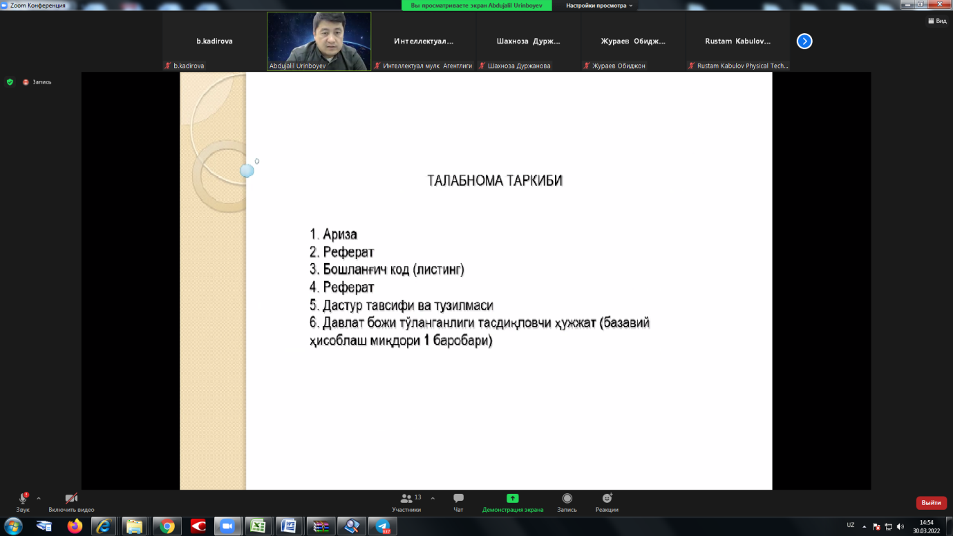 2022 yil 30-mart kuni O’zbekiston Respublikasi Prezidentining 2021 yil 28-yanvardagi “Intellektual mulk obektlarini muhofaza qilish tizimini takomillashtirish chora tadbirlari to’g’risida”gi PQ-4965-son qarori bilan tasdiqlangan Intellektual mulk (ixtiro, foydali model, sanoat namunasi, seleksiya yutuqlari) sohasini rivojlantirish bo‘yicha 2021 — 2023 yillarga mo‘ljallangan amaliy ishlar ijrosi yuzasidan O‘zbekiston Respublikasi Adliya vazirligi huzuridagi Intellektual mulk agentligi va agentlikning konsultativ markazi mutaxassislari ishtirokida O‘zbekiston Respublikasi Fanlar Akademiyasi "Fizika-Quyosh" IIChB Fizika-texnika instituti hamda O‘zbekiston Respublikasi Fanlar Akademiyasi S.Y.Yunusov nomidagi O‘simlik moddalari kimyosi institutilari bilan birgalikda 2022 yilda o‘tkazilishi rejalashtirilgan tarmoqli reja-jadvali asosida “Sanoat namunasini huquqiy muhofaza qilish tartibi” va “EHM uchun dastrular va ma’lumotlar bazalarining huquqiy muhofazasi” mavzusida navbatdagi seminar o‘tkazildi. Mazkur seminar onlayn tarzda ZOOM dasturidan foydalangan holda tashkil etildi.