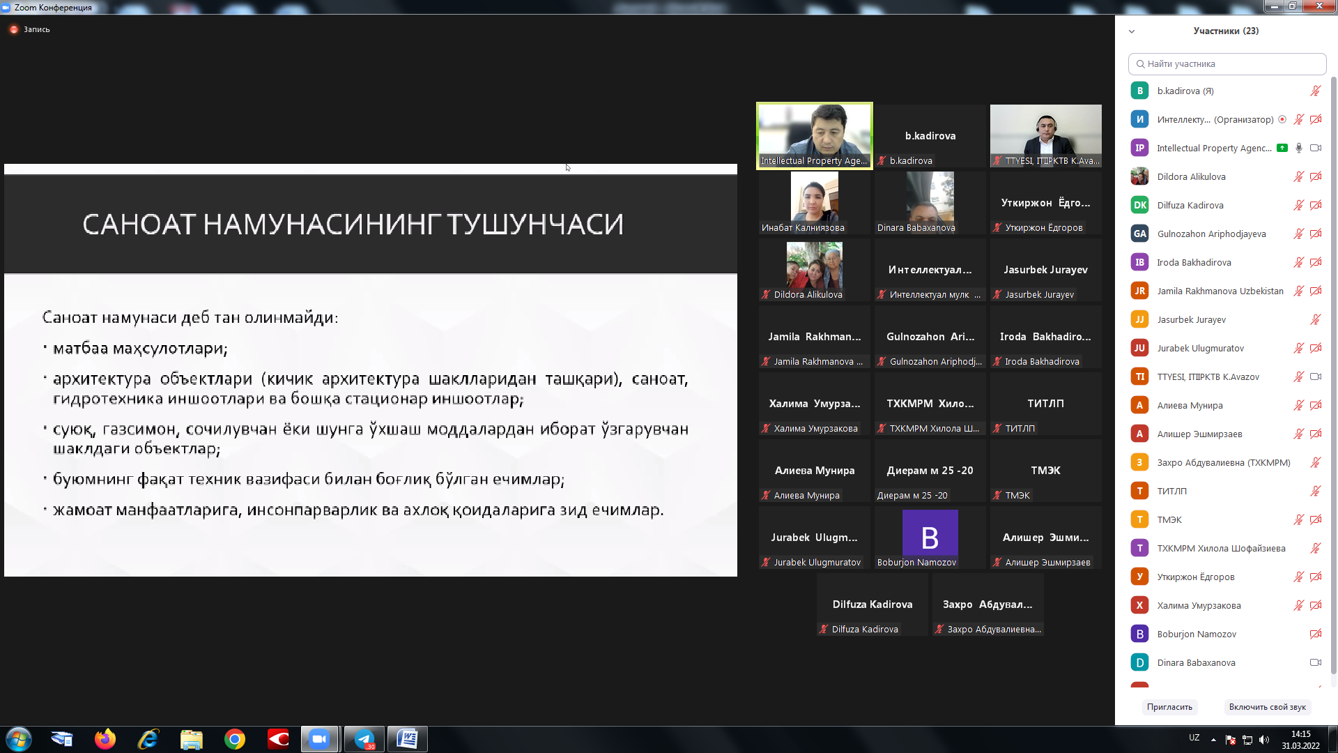 Onlayn seminarda ta’lim muassasalarining professor-o‘qituvchilari, doktarantlar, yosh ilmiy xodimlar ishtirok etishdi. Seminar mavzusini Adliya Vazirligi huzuridagi Intellektual mulk agentligi “Sanoat namunalari” bo‘lim boshlig‘i O‘rinboyev A.J. yoritib berdi.