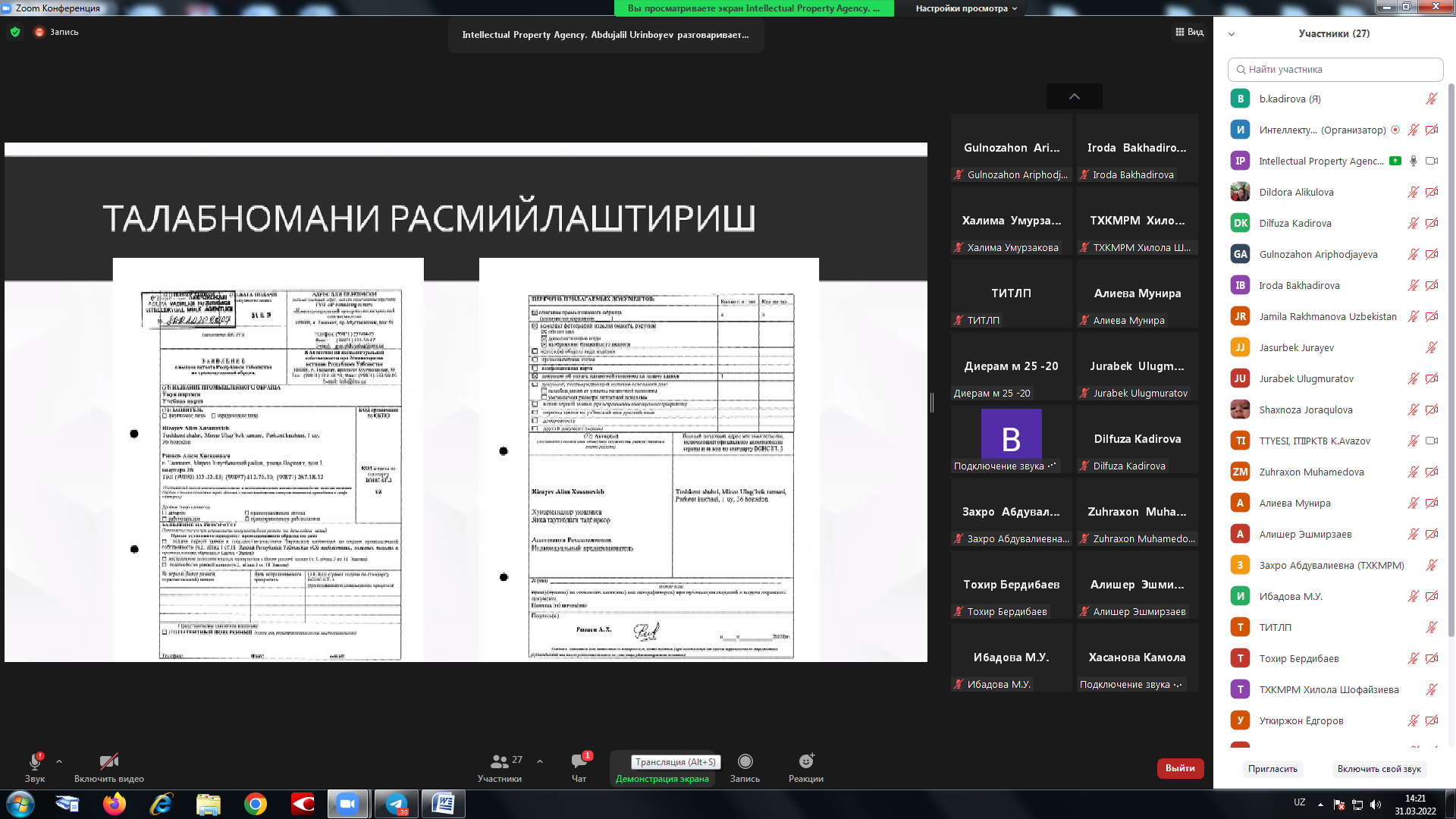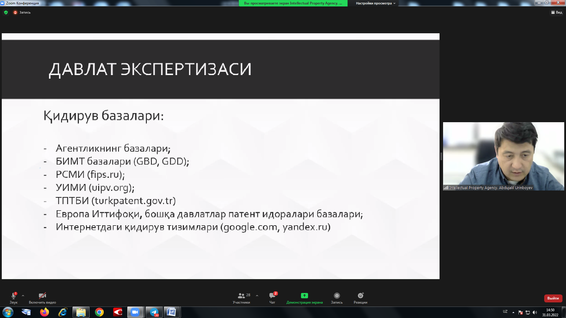 2022 yil 31-mart kuni O’zbekiston Respublikasi Prezidentining 2021 yil 28-yanvardagi “Intellektual mulk obektlarini muhofaza qilish tizimini takomillashtirish chora tadbirlari to’g’risida”gi PQ-4965-son qarori bilan tasdiqlangan Intellektual mulk (ixtiro, foydali model, sanoat namunasi, seleksiya yutuqlari) sohasini rivojlantirish bo‘yicha 2021 — 2023 yillarga mo‘ljallangan amaliy ishlar ijrosi yuzasidan O‘zbekiston Respublikasi Adliya vazirligi huzuridagi Intellektual mulk agentligi va agentlikning konsultativ markazi mutaxassislari ishtirokida Toshkent to‘qimachilik va yengil sanoat instituti va Tibbiyot xodimlarinin kasbiy malakasini rivojlantirish markazlari bilan birgalikda 2022 yilda o‘tkazilishi rejalashtirilgan tarmoqli reja-jadvali asosida “Sanoat namunasini huquqiy muhofaza qilish tartibi” va “EHM uchun dastrular va ma’lumotlar bazalarining huquqiy muhofazasi” mavzusida navbatdagi seminar o‘tkazildi. Mazkur seminar onlayn tarzda ZOOM dasturidan foydalangan holda tashkil etildi.