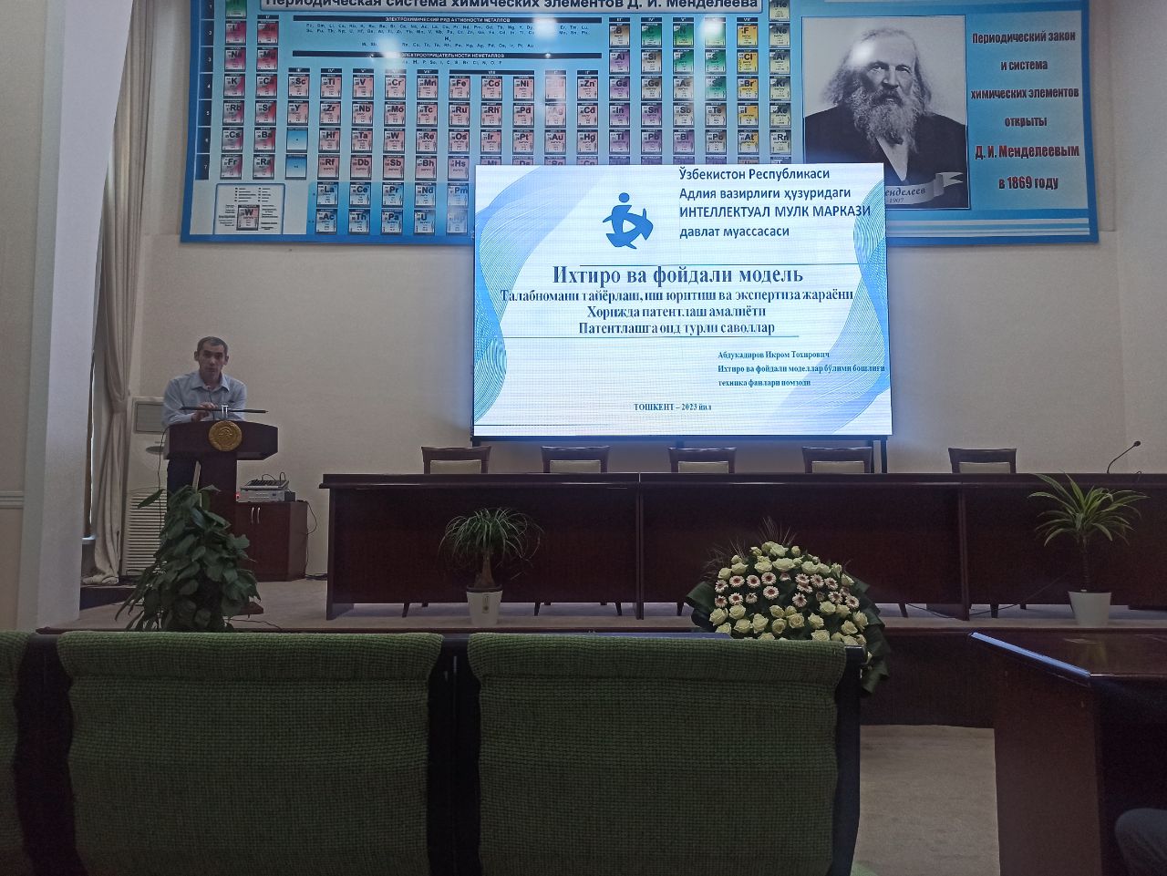 Oʼzbekiston Respublikasi Prezidentining 2021 yil 28 yanvardagi “Intellektual mulk obʼetlarini muhofaza qilish tizimini takomillashtirish chora-tadbirlari toʼgʼrisida”gi PQ-4965-son qarori ijrosini taʼminlash hamda joylardagi Texnologiya va innovatsiyalarni qoʼllab quvvatlash markazlari (TIQQM) da seminarlar oʼtkazish yuzasidan 2023 yil uchun tasdiqlangan Tarmoqli reja asosida joriy yilning 16-17 mart kunlari O‘zbekiston Respublikasi Аdliya vazirligi huzuridagi “Intellektual mulk markazi” davlat muassasasi tomonidan Tibbiyot xodimlarining malakasini oshirish markazi hamda O‘zbekiston Respublikasi Fanlar Аkademiyasi Аkademik S.Yu.Yunusov nomidagi O‘simlik moddalari kimyosi instituti TIQQMlari hamkorligida ushbu muassasalarda faoliyat olib borayotgan o‘zlarining intellektual mehnatlari mahsulini muhofaza qilishdan manfaatdor ilm egalari va professor-o‘qituvchilari tarkibi uchun “Ixtiro va foydali modelga talabnoma tayyorlash, ish yuritish va ekspertiza jarayoni”, “Xorijda patentlash amaliyoti” mavzularida o‘quv seminari o‘tkazildi.