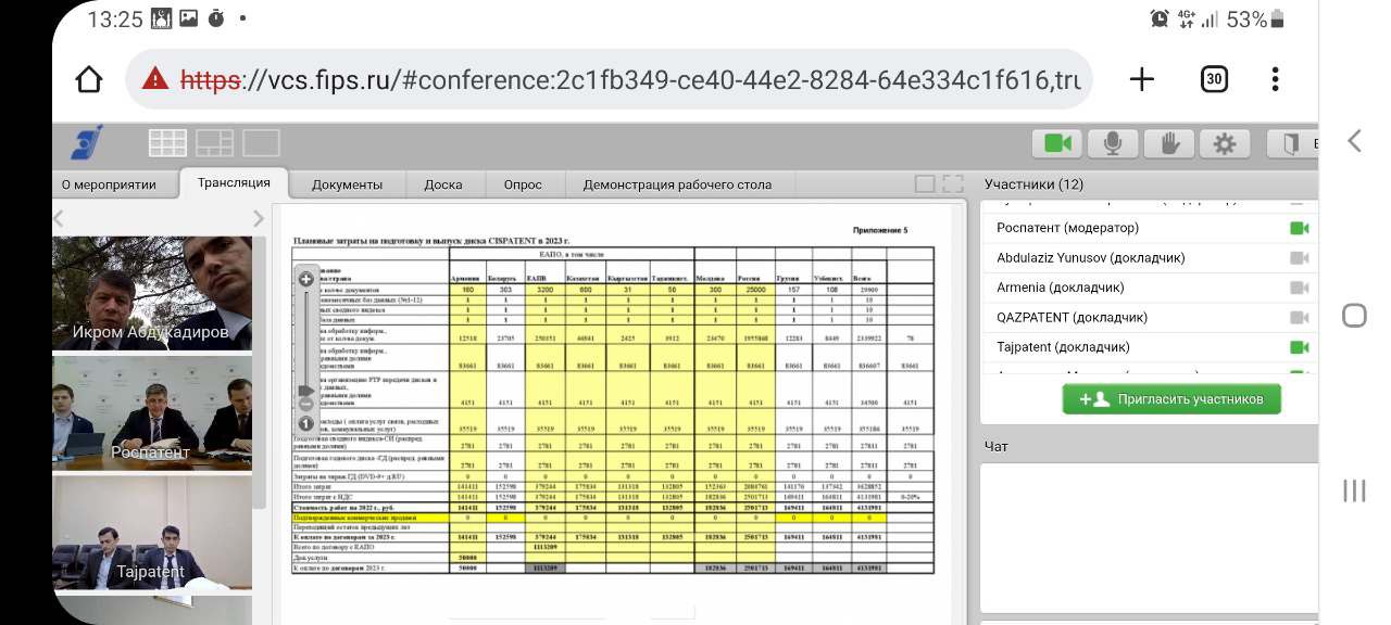 CISPATENT loyihasi doirasida Mintaqaviy patentaxborotnomasini nashr etish bo‘yicha 2023-yil 11-aprelda videokonferenstaloqa shaklida Muvofiqlashtiruvchi kengashning navbatdagi yig‘ilishi bo‘lib o’tdi. Yig‘ilishda CISPATENT loyihasi ishtirokchilari Yevroosiyo patent boshqarmasi, Rossiya Federatsiyasi, Armaniston, Belarusiya, Qozoqiston, Qirg‘iziston, MoldaviyaTojikiston, Gruziya vakillari hamda O’zbekiston tarafidan Intellektual mulk markazi davlat muassasi xodimlari S.Raxmanov, I. Abdukadirov va S. Shamansurovalar ishtirok etishdi