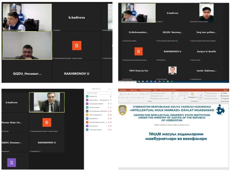 Joriy yilning 29-yanvar – 2-fevral kunlari davomida Adliya vazirligi huzuridagi Intellektual mulk markazi mutaxassislari tomonidan oliy ta’lim muassasalarida faoliyat yuritayotgan TIQQM mas’ul vakillarining intellektual mulk sohasidagi bilim va ko‘nikmalarini oshirishga qaratilgan onlayn o‘quv kurslariga start berildi.